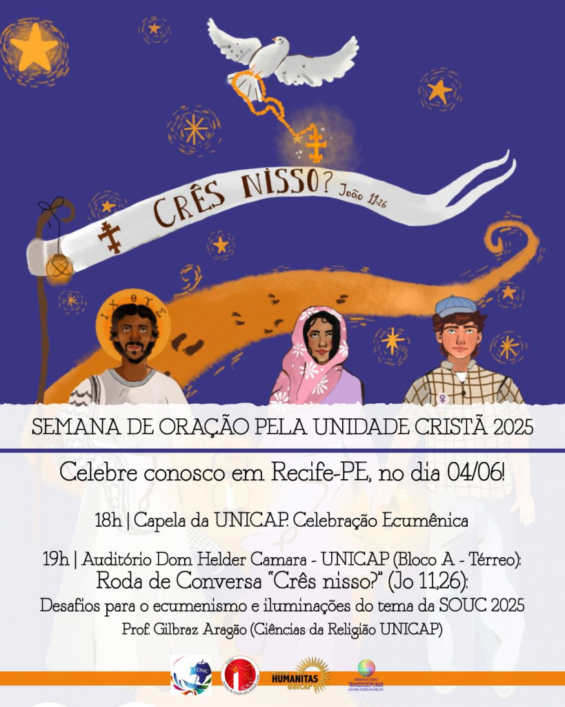 Promovida mundialmente pelo Pontifício Conselho para a Promoção da Unidade dos Cristãos e pelo Conselho Mundial de Igrejas, a Semana de Oração pela Unidade Cristã (SOUC) acontece em períodos diferentes nos dois hemisférios. No hemisfério Sul, o período tradicional para a Semana de Oração pela Unidade Cristã é a semana que antecede a festa de Pentecostes. A SOUC 2025, ao nos perguntar “Crês nisso?” retoma o questionamento que motivou o primeiro Concílio Ecumênico do qual se tem notícias, realizado no ano de 325 d. C., na cidade de Nicéia (atual Iznik, na Turquia). Neste ano, então, comemoramos 1.700 anos do Concílio Ecumênico da Nicéia: venha celebrar conosco! Vamos nos reunir com religiosos de várias igrejas cristãs no campus da UNICAP no Recife, quarta dia 4, às 18h na Capela, e às 19h no Auditório Dom Helder.