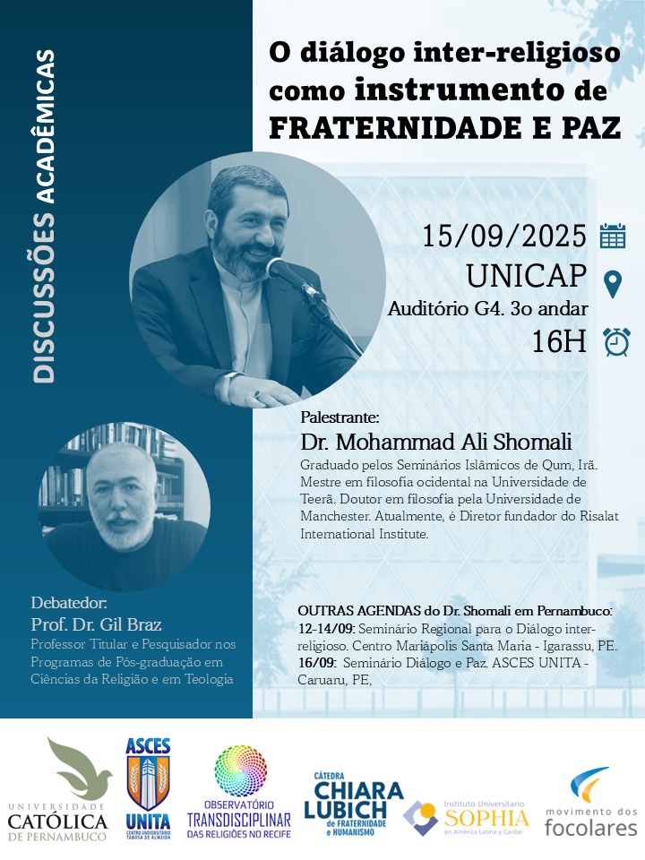 Vamos receber o Dr. Mohammad Ali Shomali na UNICAP, para falar sobre “O diálogo inter-religioso como instrumento de fraternidade e paz”. Será no dia 15 de setembro, uma segunda-feira, às 16h, no auditório do 3º andar do bloco G4, com tradução simultânea e transmissão aqui pela internet. Em meio às guerras por aí, mas tendo em vista a justiça socioambiental e a paz em nossa Casa Comum, o professor Gilbraz, coordenador do Observatório das Religiões da Católica e debatedor no evento, vai puxar conversa sobre fraternidade no mundo, com esse sheik estudioso do islamismo xiita e grande animador do diálogo inter-religioso. O Dr. Mohammad Ali Shomali é graduado pelos Seminários Islâmicos de Qum e também possui bacharelado e mestrado em Filosofia Ocidental pela Universidade de Teerã, obteve seu doutorado em Filosofia pela Universidade de Manchester: a tese de doutorado foi sobre relativismo ético e a pesquisa de pós-doutorado sobre questões éticas relacionadas à vida e à morte. Ele é ex-diretor do Centro Islâmico da Inglaterra, em Londres, e atualmente é diretor do Instituto Internacional Risalat em Qum, no Irã.