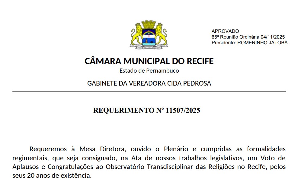 Então, o Requerimento aprovado pelo legislativo municipal (veja aqui a íntegra do documento), argumenta que “por sua trajetória exemplar de promoção do respeito à diversidade religiosa, da cultura da paz e da justiça socioambiental, o Observatório Transdisciplinar das Religiões no Recife é merecedor de um Voto de Aplausos e Congratulações, como reconhecimento público de sua contribuição acadêmica e social para a construção de um mundo mais justo, plural e solidário”.