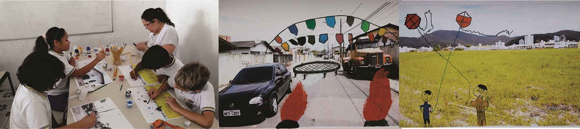 - Figura 4: Alunos desenham e pintam sua interpretação dos bens culturais pesquisados sobre fotografias feitas pela aluna do curso de fotografia da UNIVALI, Ana Crespi.